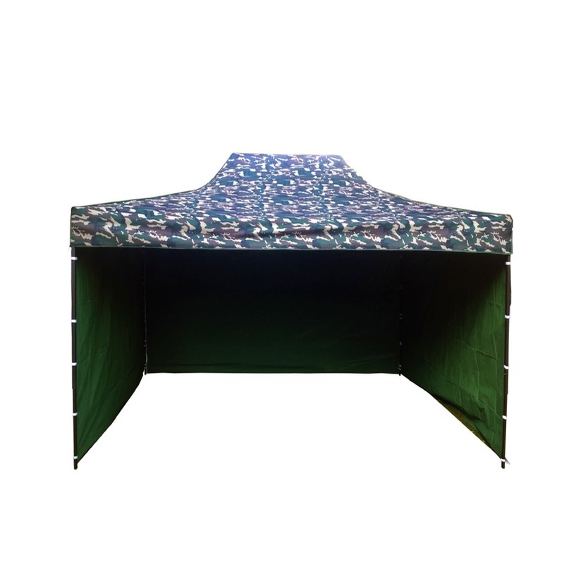 Prodejní stánek s rychleskládající se nůžkovou konstrukcí, vybavený třemi postranními odnímatelnými panely, připevněnými suchým zipem a čtyřstupňovou možností regulaci jeho výšky.