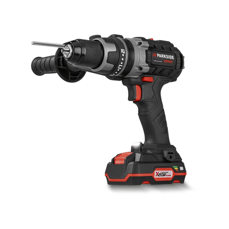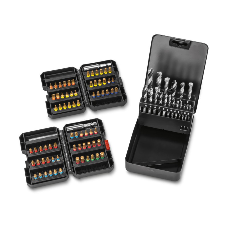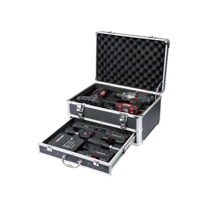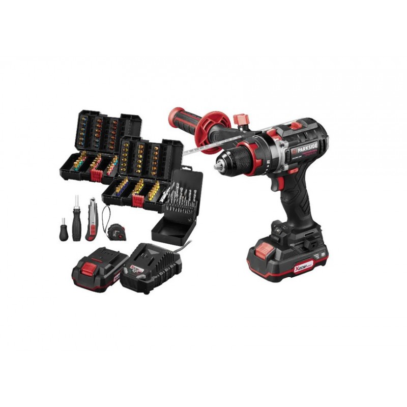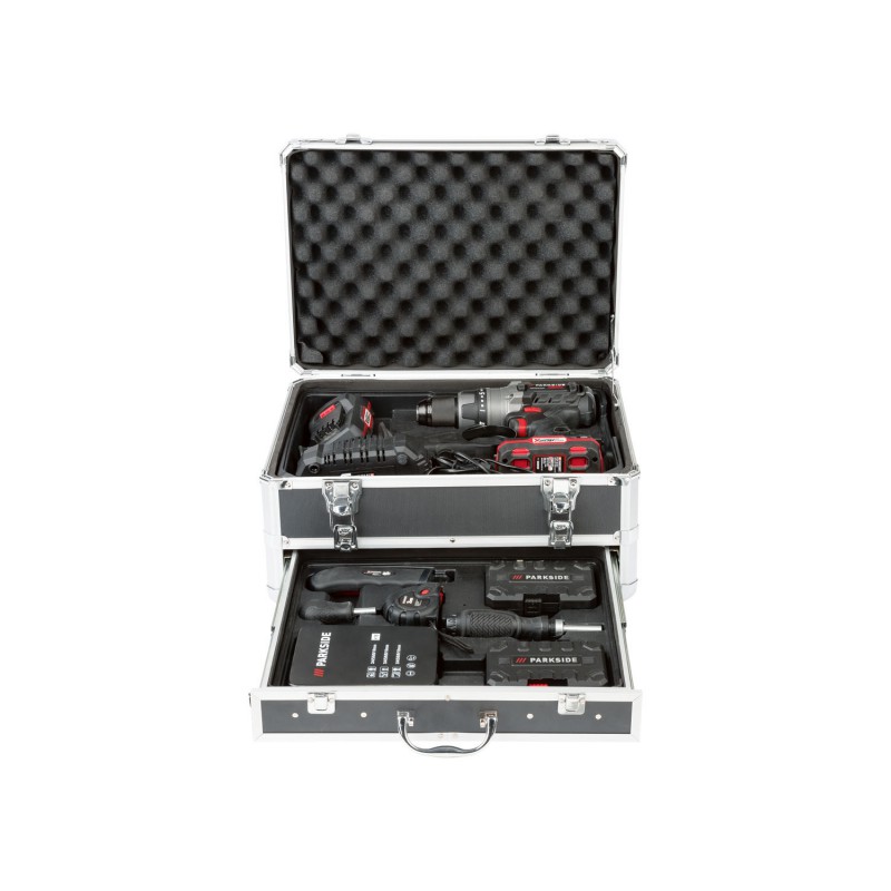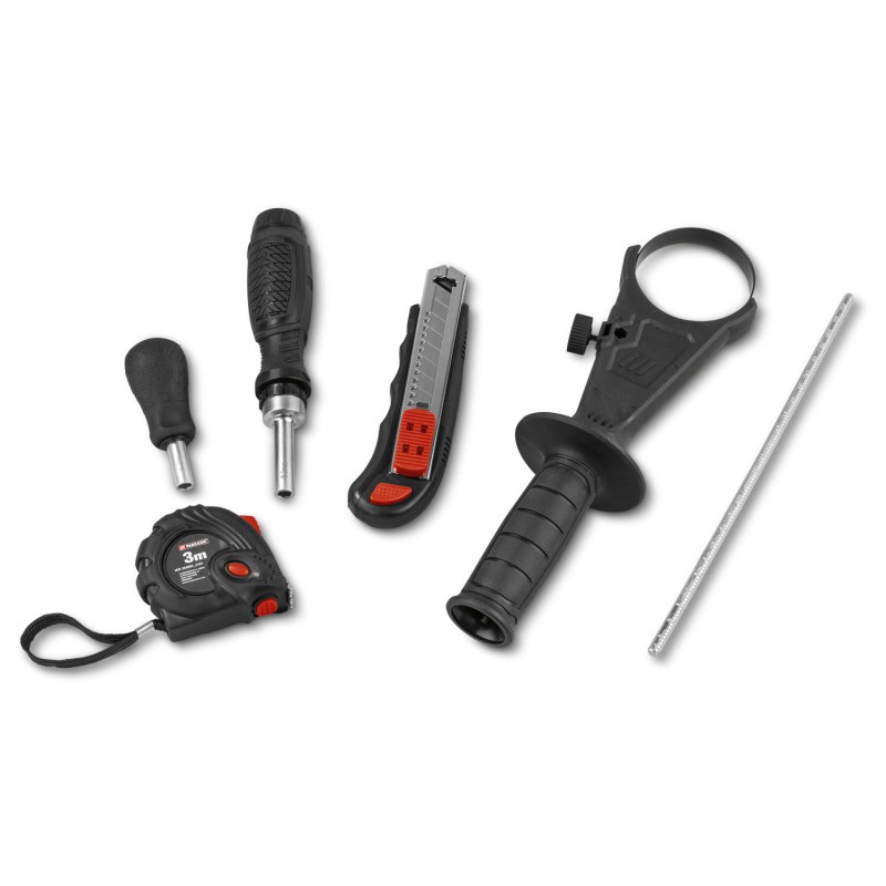 | Příslušenství: | 2x akumulátor (každý 2 Ah), 1x nabíječka akumulátoru (2,4 A), 1x přídavná rukojeť, 1x hloubkový doraz, 1x odlamovací nůž (s 8 čepelemi), 1x metr (3 m), 1x ráčnový šroubovák (¼“), 1x držák bitů pro šroubovák (¼“), 6x vrták do dřeva, 6x vrták do kovu, 6x vrták do kamene, 2x držák bitů (60 mm), 72x bity |