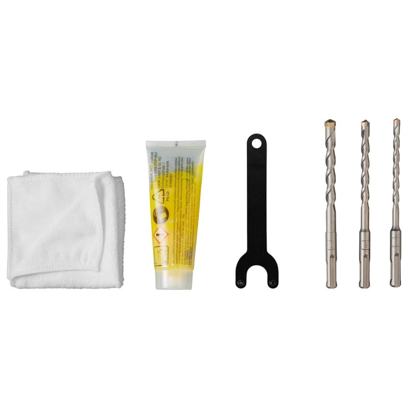 | Příslušenství: | 1x přídavné držadlo (předmontováno), 1x hloubkový doraz (předmontován), 3x SDS vrták s ostřím ve tvaru X (Ø 6 mm / 8 mm / 10 mm), 1x šroubový klíč pro kryt těla nářadí, 1x tuba mazacího tuku (50 g), 1x hadřík |